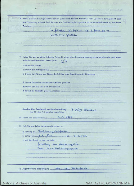 Until I retrieved those documents several years ago, I had absolutely no memory of what I had written on my application, nor any memory of the interview or the subsequent medical examination. For fifty-seven years, all I remembered was that small advert by the "Australische Auskunfts- und Auswanderungs-Büro" in the German Bild Zeitung which started it all. I cut it out, completed it, and mailed it in - and the rest is history!